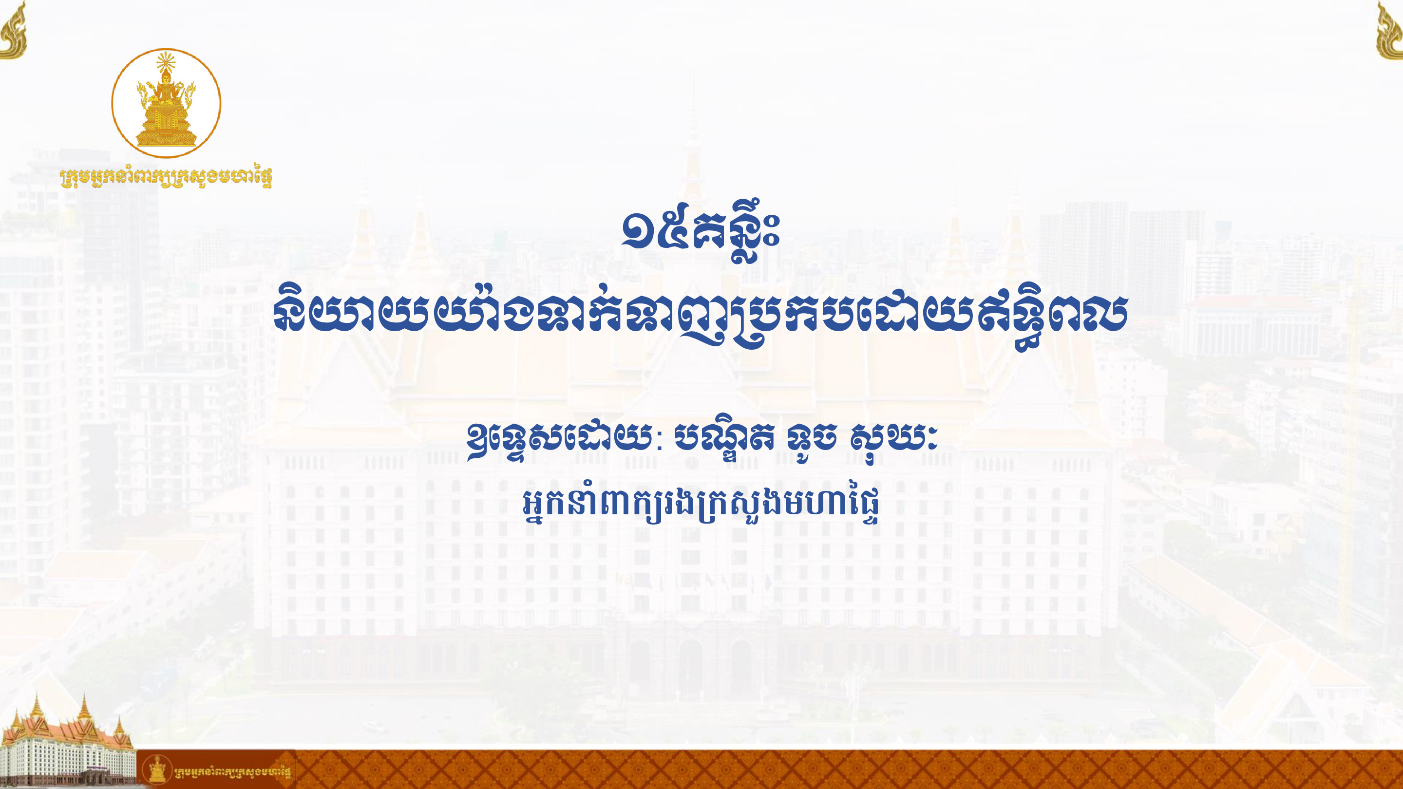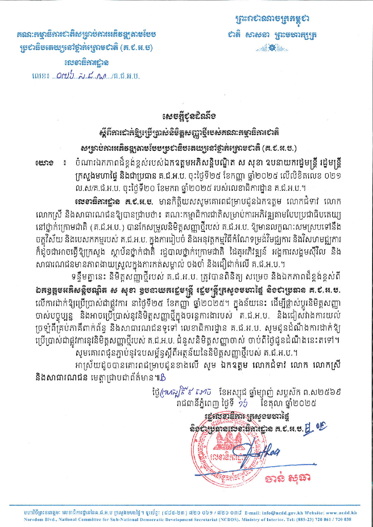 ក្នុងនាមគណៈកម្មាធិការជាតិសម្រាប់ការអភិវឌ្ឍតាមបែបប្រជាធិបតេយ្យនៅថ្នាក់ក្រោមជាតិ (គ.ជ.អ.ប.) ខ្ញុំសូមស្វាគមន៍សម្តេច ឯកឧត្តម លោកជំទាវ លោក លោកស្រី ដែលបានចូលមកទស្សនាគេហទំព័ របណា្ណល័យអេឡិចត្រូនិករបស់ គ.ជ.អ.ប. ដើម្បីស្វែងរកព័ត៌មានជាច្រើន អំពីគោលនយោបាយ ច្បាប់ លិខិតបទដ្ឋានគតិយុត្ត កម្មវិធីជាតិ របាយការណ៍សិក្សា និងឯកសារពាក់ព័ន្ធនឹងកំណែទម្រង់នានា។ ខ្ញុំសូមលើកទឹកចិត្តនូវការលើកឡើងរាល់មតិយោបល់ កែលម្អនានាទាក់ទងនឹងគេហទំព័របណ្ណាល័យអេឡិចត្រូនិកនេះ។