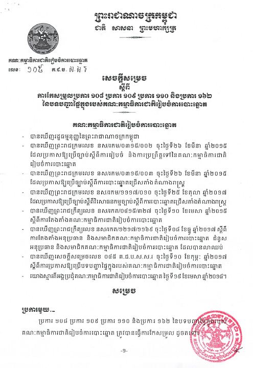 ​សេចក្ដី​សម្រេច លេខ១០៥គជប.សសរ​ចុះថ្ងៃទី២៣ ខែមេសា ឆ្នាំ២០១៨ ស្ដីពី​ការកែ​សម្រួល​ប្រការ ១០៨ ប្រការ ១០៩ ប្រការ ១១០ និង​ប្រការ ១៦២ នៃ​បទបញ្ជា​ផ្ទៃ​ក្នុង​របស់ គ.ជ.ប