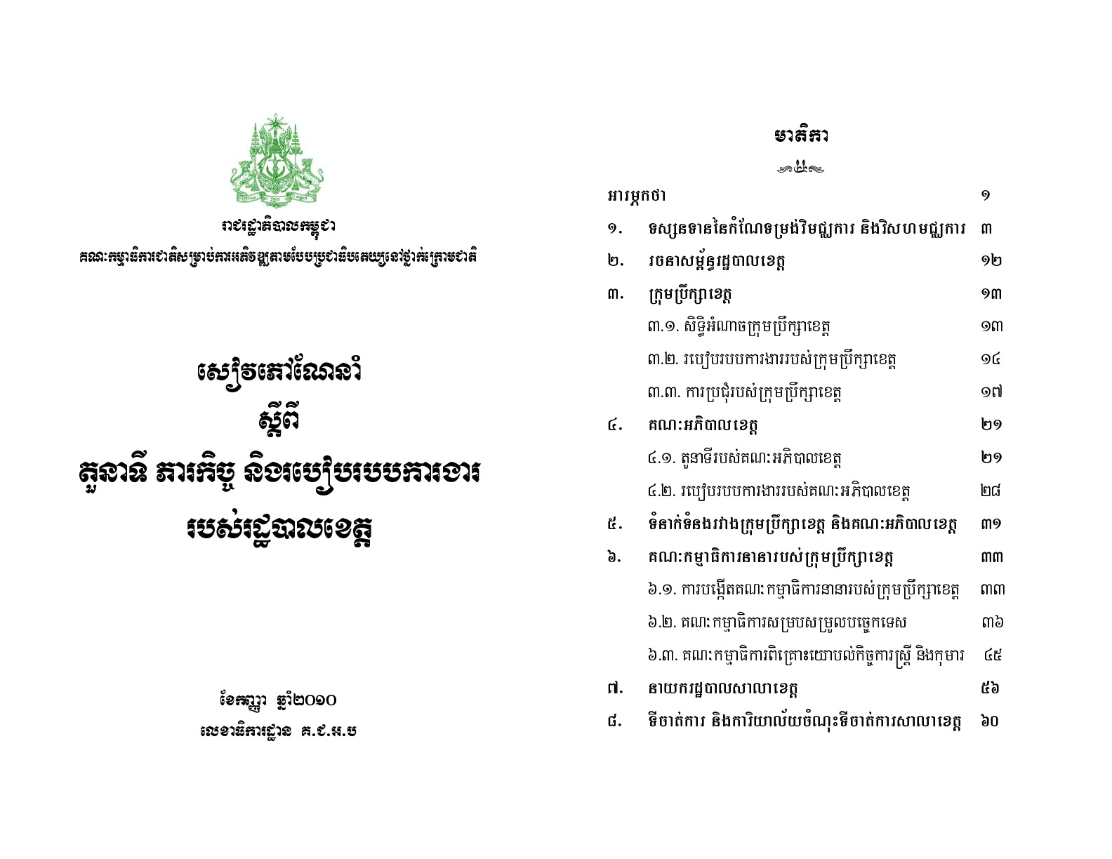 លិខិតបទដ្ឋានគតិយុត្តនានា ពាក់ព័ន្ធនឹងការគ្រប់គ្រងបុគ្គលិករដ្ឋបាលថ្នាក់ក្រោមជាតិ គោលនយោបាយ ស្តីពីការគ្រប់គ្រង់ និងការអភិវឌ្ឍធនធានមនុស្ស នៅរដ្ឋបាលថ្នាក់ក្រោមជាតិ (រៀបចំ និងចងក្រងដោយ៖គណៈកម្មាការដឹកនាំកំណែទម្រង់វិមជ្ឈការ និងវិសហមជ្ឈការ ក្រសួងមុខងារសាធារណៈ)