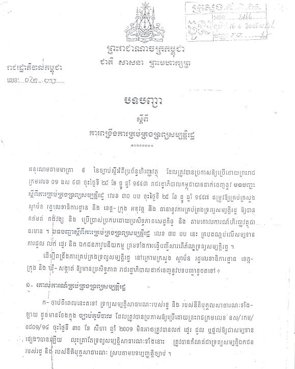 • ប្រធានបទ៖ Regulation ; លិខិតបទដ្ឋានគតិយុត្ត ; State property ; ទ្រព្យសម្បត្តិរដ្ឋ
