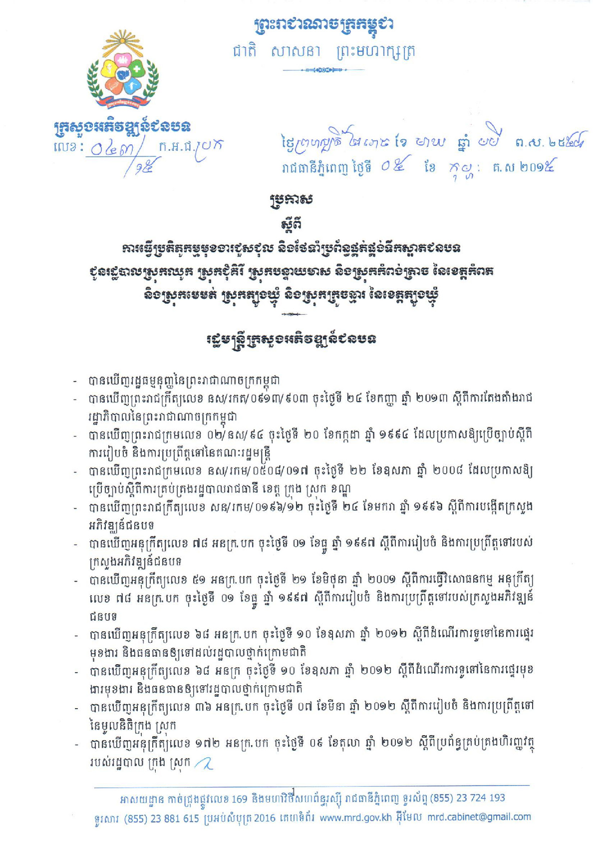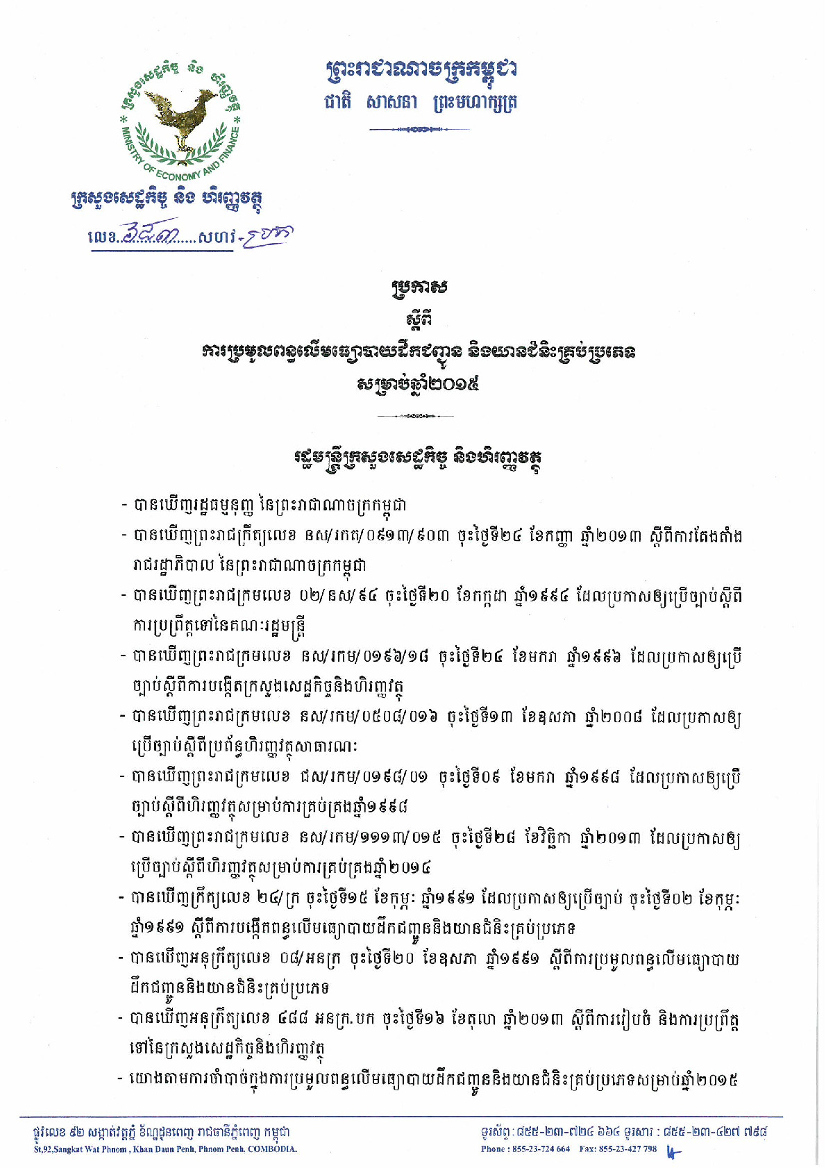 • ប្រធានបទ: ការប្រមូលពន្ធលើមធ្យោបាយដឹកជញ្ជូន និងយានជំនិះគ្រប់ប្រភេទសម្រាប់ឆ្នាំ២០១៥